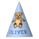 Cute Teddy Bear Toy Blue Kid`s Birthday Party Hat. Cute birthday party hats for kids. Cute brown teddy bear toy drawing and a name on blue - personalise with your name and make a unique birthday party surprise for everyone.