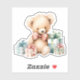 Contour sticker with a cute illustration featuring a Victorian style teddy bear. Wearing a fancy red bow. Drawn in a a cute old fashioned vintage style. Red and blue pastel Christmas presents surround this warm-hearted bear.
