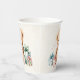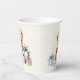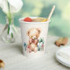 Paper cups with a cute illustration featuring a Victorian style teddy bear. Wearing a fancy red bow. Drawn in a a cute old fashioned vintage style. Red and blue pastel Christmas presents surround this warm-hearted bear.