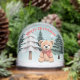 This adorable snow globe features a picture of a teddy bear in a winter wonderland with snow and trees. The greeting 'Merry Christmas' curves over the top of the image in red lettering. The reverse side also features a winter snow scene, and can be personalised with a name. Ideal as a cute festive gift.