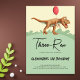 Simple and cute third birthday invitation with an illustration of a T-rex holding a red balloon, perfect for a boy third birthday party. Illustrated and designed by Patricia Alvarez.