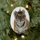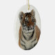 Adorable portrait photograph of a tiger cub sat in the snow with a snowflake on the tip of it's nose. Christmas ornament.