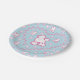 These paper party plates feature cute Toy Poodle dogs that have been groomed and have heart-shaped paw prints. Pink and white on a light blue background. Great for kids parties.