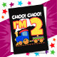 This train birthday party theme design features fun cartoon train graphic illustration with caboose car & number. Big, bright, eye popping, train on railroad tracks with choo choo train design will get lots of compliments at the kid's birthday party!