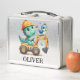 This personalised lunch box features a charming dinosaur joyfully driving a miniature construction vehicle with its playful expression and vibrant colours.