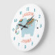 This is a cute clock, especially for two boys. It features a blue grey elephant wearing tribal attire in colours of orange, black, teal, and yellow. Above and below the elephant image are text fields in matching orange. The teal numbers make the clock easy to read. If you need only one text field, just blank out the one you don't need.