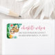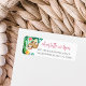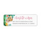 Island chic design features monstera leaves and green watercolor foliage with a sweet sloth hanging from the trees, adorned with a pink flower on her head. Colourful tropical floral accents complete the design. Personalise with your name and return address. Designed to coordinate with our Tropical Jungle Animals kids birthday collection.