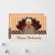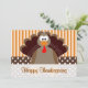 Cute Cartoon Turkey Happy Thanksgiving Flat Card. Brown and White Polka Dots and Orange Stripes.