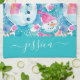 Cute turquoise snowmen script name kitchen towel. Personalize name.