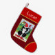 This cute design features a happy tuxedo cat sitting in the snow in front of two festively decorated Christmas trees. He is wearing a jolly red hat, as well as matching booties and a matching tail warmer. This design is set against a deep red background, and the name on the stocking appears in white in a lighter red area at the top with gold trim. There is also a matching ligther red area at the toe with gold trim. You can personalise this item for yourself or a loved one by changing the name at the top.