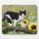 Cute tuxedo cat on a tree branch with sunflowers - mouse pad