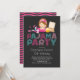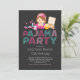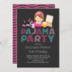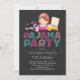 Cute sleepover party invitation featuring a brunette girl on a pillow with a bowl of popcorn, pizza and makeup items set on a classy black background. Our stylish, modern & fun pajama party invite has chevron typography letting in pink, turquoise blue & light pink. Flip our slumber party invite over to view a coordinating chevron stripe back for an extra special touch. Perfect for a tween birthday party or teen birthday party.