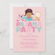 Cute sleepover party invitation featuring a african american girl on a pillow with a bowl of popcorn, pizza and makeup items set on a classy light pink background. Our stylish, modern & fun pajama party invite has chevron typography letting in pink, turquoise blue & light pink. Flip our slumber party invite over to view a coordinating chevron stripe back for an extra special touch. Perfect for a tween birthday party or teen birthday party.