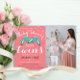 Join us for a delightful twin baby shower celebration! This charming invitation features two cute cartoon bunnies in turquoise tones on a soft coral pink background. The lovely modern calligraphy in black and white adds a personal touch, with customisable text for your special message. Personalise it further by adding your own photo on the right side of the future mum-to-be. The reverse side is a pastel turquoise hue adorned with a playful coral pink heart pattern. It's the perfect way to invite loved ones to share in the joy of this exciting occasion!
