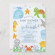Sweet under the sea themed baby shower invitation for a baby boy featuring various sea creatures, seaweed and bubbles. This boy's under the sea baby shower invitation is ideal for an under the sea themed baby shower.