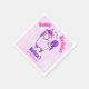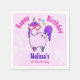 Birthday party paper napkins with a whimsical drawing of a cool and funky pink unicorn which has a purple mane and tale. This cute creature is wearing heart-shaped sunglasses and is decorated with little stars. Pink watercolor background.