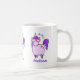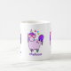 A mug with a whimsical drawing of a cool and funky pink cubby unicorn which has a purple mane and tale. This cute creature is wearing heart-shaped sunglasses and is decorated with little stars.