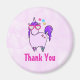 A thank you magnet with a whimsical drawing of a cool and funky pink cubby unicorn which has a purple mane and tale. This cute creature is wearing heart-shaped sunglasses and is decorated with little stars. Pink watercolor background.