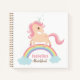 A cute and pretty little unicorn with lush pink curly hair on top of a rainbow bridge across two clouds. Personalise with name in text template provided to make a unique sketchbook or notebook for her.