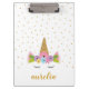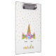 A clipboard with a cute magical unicorn with pastel flowers and glitter horn adorned with glitter confetti.
