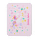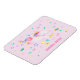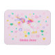 NewParkLane - Personalised kids magnet featuring a cute jumping unicorn, with whimsicial colourful stars, flowers and hearts, against a blush pink background, and a text template for a name.