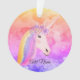 Cute Unicorn Rainbow Colourful Clouds Personalised Ornament makes a great gift idea for a child who loves unicorns. Background designed with rainbow colours and a cute white unicorn styled with rainbow hair, flowers on her head and name in script.
