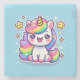 This cute, cartoon-style unicorn sits happily on a bright blue background, featuring a vibrant rainbow mane and tail with a golden horn. Its joyful expression and sparkling eyes are surrounded by twinkling stars and magical sparkles, creating a whimsical and fun design. Perfect for anyone who loves fantasy, bright colours, and adorable characters, this playful unicorn adds a touch of charm to any space.