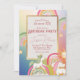The background is a rainbow gradient pattern. Two cute unicorns are pictured at the bottom with little rainbows, clouds, stars, and the sun. A gold border frames the text area.