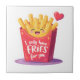 A cute and colorful cartoon illustration of a red French fries carton with a happy kawaii smiling face. The design features a floating red heart and the romantic funny pun quote "I only have FRIES for you". The image has a white sticker border, making it perfect for Valentine's Day greeting cards, fast food lovers, and humorous romantic gifts. Isolated design.
