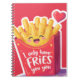 A cute and colorful cartoon illustration of a red French fries carton with a happy kawaii smiling face. The design features a floating red heart and the romantic funny pun quote "I only have FRIES for you". The image has a white sticker border, making it perfect for Valentine's Day greeting cards, fast food lovers, and humorous romantic gifts. Isolated design.