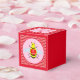 This awesome favour box features a cute little Valentines Bee. The Bee has a furry yellow body with black stripes and red antennae. It is holding on to a red heart shaped piece of honeycomb and is surrounded with sunflowers. Each flower has red petals to match the romantic bee and a black centre. There is white text in the middle of the honeycomb that says the romantic message "Bee mine". This little bee is ideal for showing your love for someone special.