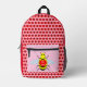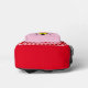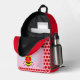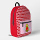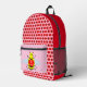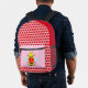 This awesome backpack features a cute little Valentines Bee. The Bee has a furry yellow body with black stripes and red antennae. It is holding on to a red heart shaped piece of honeycomb and is surrounded with sunflowers. Each flower has red petals to match the romantic bee and a black centre. There is white text in the middle of the honeycomb that says the romantic message "Bee mine". This little bee is ideal for showing your love for someone special.