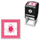 This awesome self inking stamp features a cute little Valentines Bee. The Bee has a furry yellow body with black stripes and red antennae. It is holding on to a red heart shaped piece of honeycomb and is surrounded with sunflowers. Each flower has red petals to match the romantic bee and a black centre. There is white text in the middle of the honeycomb that says the romantic message "Bee mine". This little bee is ideal for showing your love for someone special.