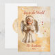 A charming vintage porcelain child angel is pictured on a cream and gold watercolor background with a sprinkle of Christmas stars. "Joy to the World" is in contrasting red script that you can change if you want to. Be sure to edit the family name and year to your own choice. On the back a little cameo image of our angel appears again.