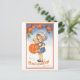 This postcard is a reproduction of a vintage Halloween postcard that features a cute girl with her puppy and a jack-o-lantern.
