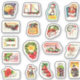 Adorable retro holidays sticker set ephemera with festive motifs: Santa, snowman, holly, bells, toys, presents, wreath, poinsettia, sleigh in snow, consisting of 18 stickers, perfect as holiday stationary envelope seals, mailing, journalling, scrapbooking, diary making, school / nursery holiday crafts etc.