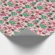 This wrapping paper features a pattern of cute watercolor Christmas gnomes dressed in red and green, along with other traditional holiday motifs, including Christmas trees, pine cones, and stockings filled with candy, on a pink background.