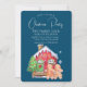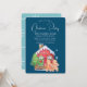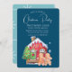 This custom Christmas holiday party invitation features a cute watercolor style illustration of gingerbread people. A little gingerbread man and lady are standing in front of their colourful gingerbread house. A pretty decorated tree is on the left. The background is a sdark ocean blue.