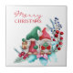 Cute watercolor Christmas gnome with Christmas tree and lantern on a wreath of mistletoe, poinsettia