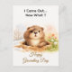 Send a smile this February with a charming illustration that perfectly captures the confusion of a groundhog emerging from his burrow. This whimsical watercolor design features a squinting woodchuck wondering if he's in for six more weeks of winter or a sudden spring bloom. It is a humorous and thoughtful way to celebrate Groundhog Day with friends, family, or nature enthusiasts who appreciate a good pun. The soft pastel flowers and snowy background beautifully bridge the transition between the seasons.
