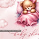 Amazing design for girly Baby Shower invitations features Cute Watercolor pink sleeping teddy bear at cloud. Modern Script typography.