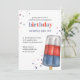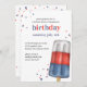 This design features a watercolor red-white blue birthday, with a QR code website online URL, a Facebook social media event page, a summer fourth of July 4th, a backyard outdoor picnic BBQ birthday, a patriotic independence day birthday, a cute whimsical fun celebration, a festive summer celebrate a party, a simple minimalist modern typography, a cute popsicle treat sweet artwork