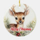 Friendly festive design for ceramic Christmas tree ornament featured watercolor little reindeer with Christmas greenery and holly berry and red typography "Merry Christmas".