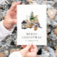 This cosy, rustic holiday postcard features a watercolor illustration of a cute female gnome seated next to a miniature Christmas tree, a basket of birch logs, and some candles. The words "MERRY CHRISTMAS" appear in grey serif letters that coordinate with the art. Add your family's name and the year in charcoal grey italics. The back of the card features a coordinating pattern of holiday motifs, with a cute male gnome in the centre.
