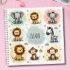 This adorable personalised kids' notebook features a charming collection of sketched animal-themed doodles featuring lions, zebras, elephants and monkeys. It is designed with soft, rounded lines and pastel backgrounds in mint green, baby pink, powder blue, and pale yellow.