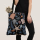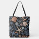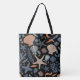 A breezy colourful watercolor summer tote bag with a pattern of seashells, coral and starfish, in bold blue and orange hues on black. This larger version tote is perfect for carrying your personal items to the beach, or simply for a cheerful summer theme for everyday.