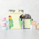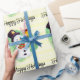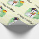 This is an adorable Christmas wrapping paper featuring a watercolor image of a snowman holding a gift on a light yellow striped pattern with the words "Happy Holidays". The text on the wrapping paper can be customised with your own or left as is.