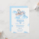 Cute Watercolor Blue Penguin Pilot Invitation with a textured background, blue clouds. The background has white stars on a blue background. Mum to be will love this cheerful boys baby shower invitation.