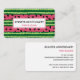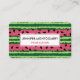 A business card with a cute watermelon pattern. Green rind in layers of stripes along with a layer of pink stripes with black seeds inside.