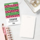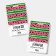 A name tag with a cute watermelon pattern. Green rind in layers of stripes along with a layer of pink stripes with black seeds inside.